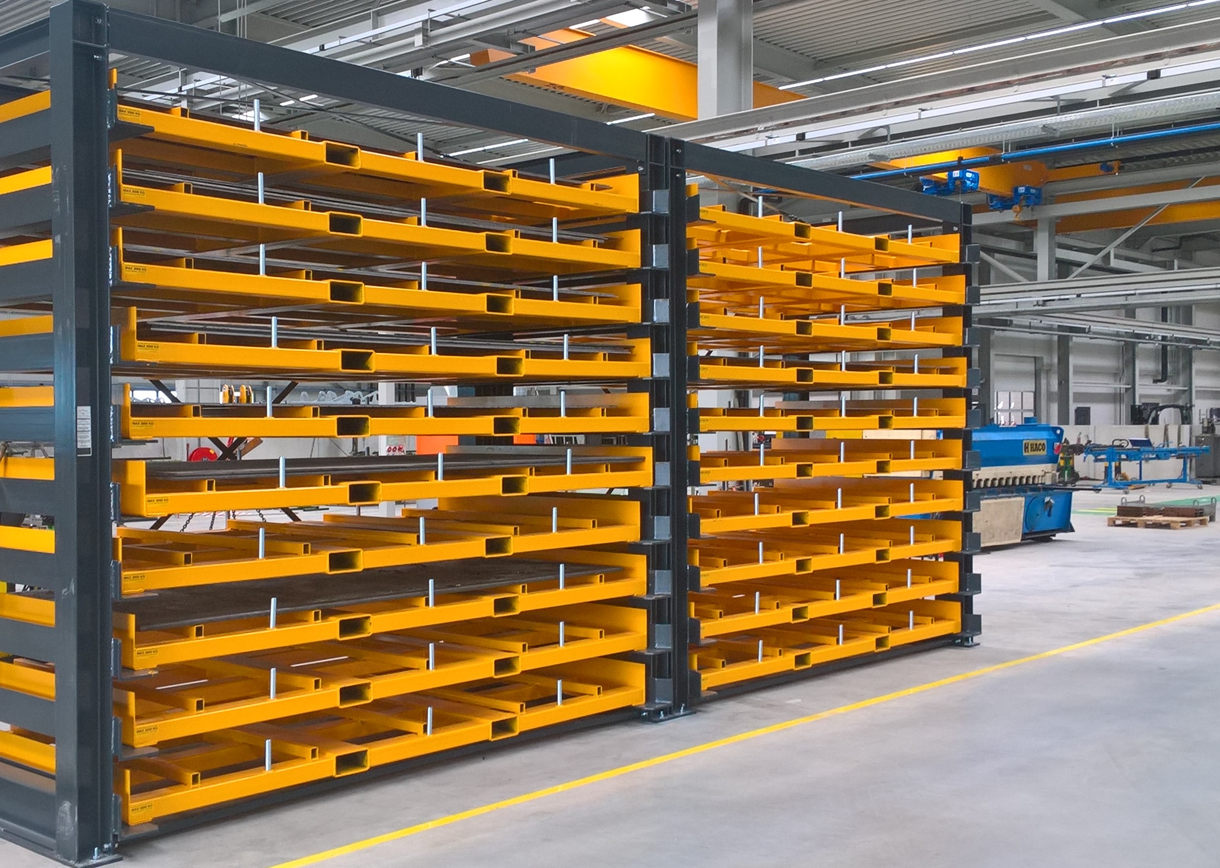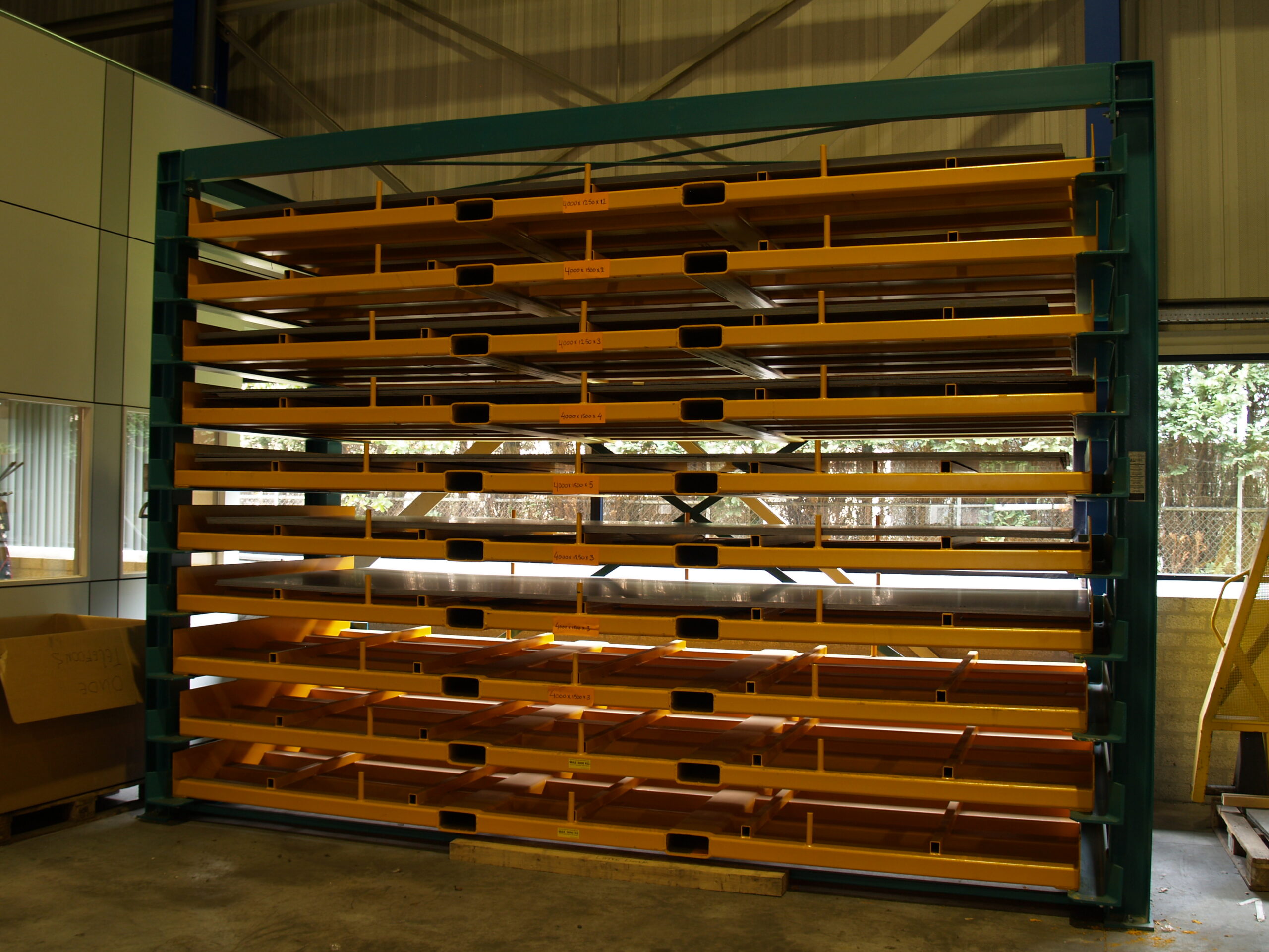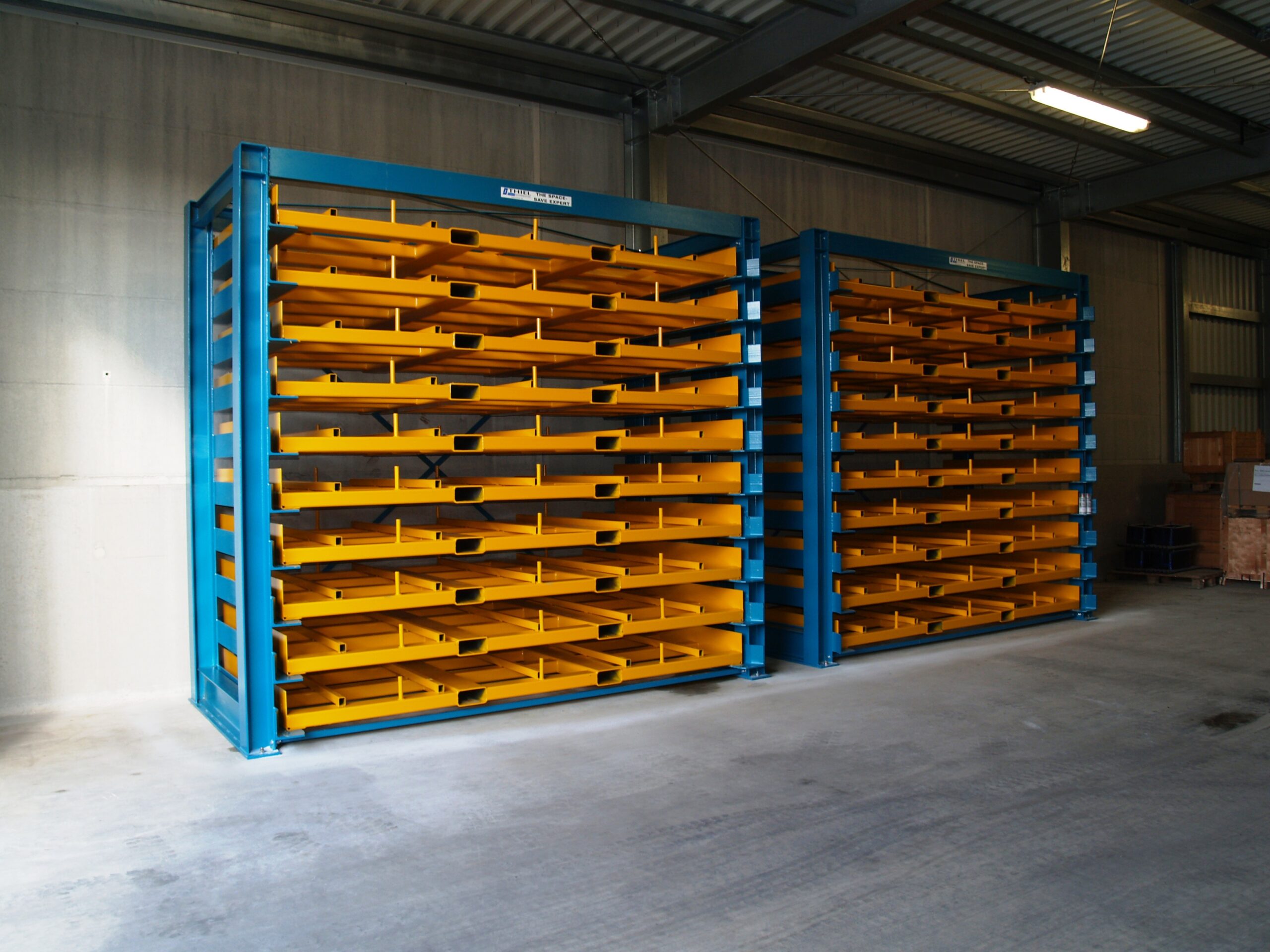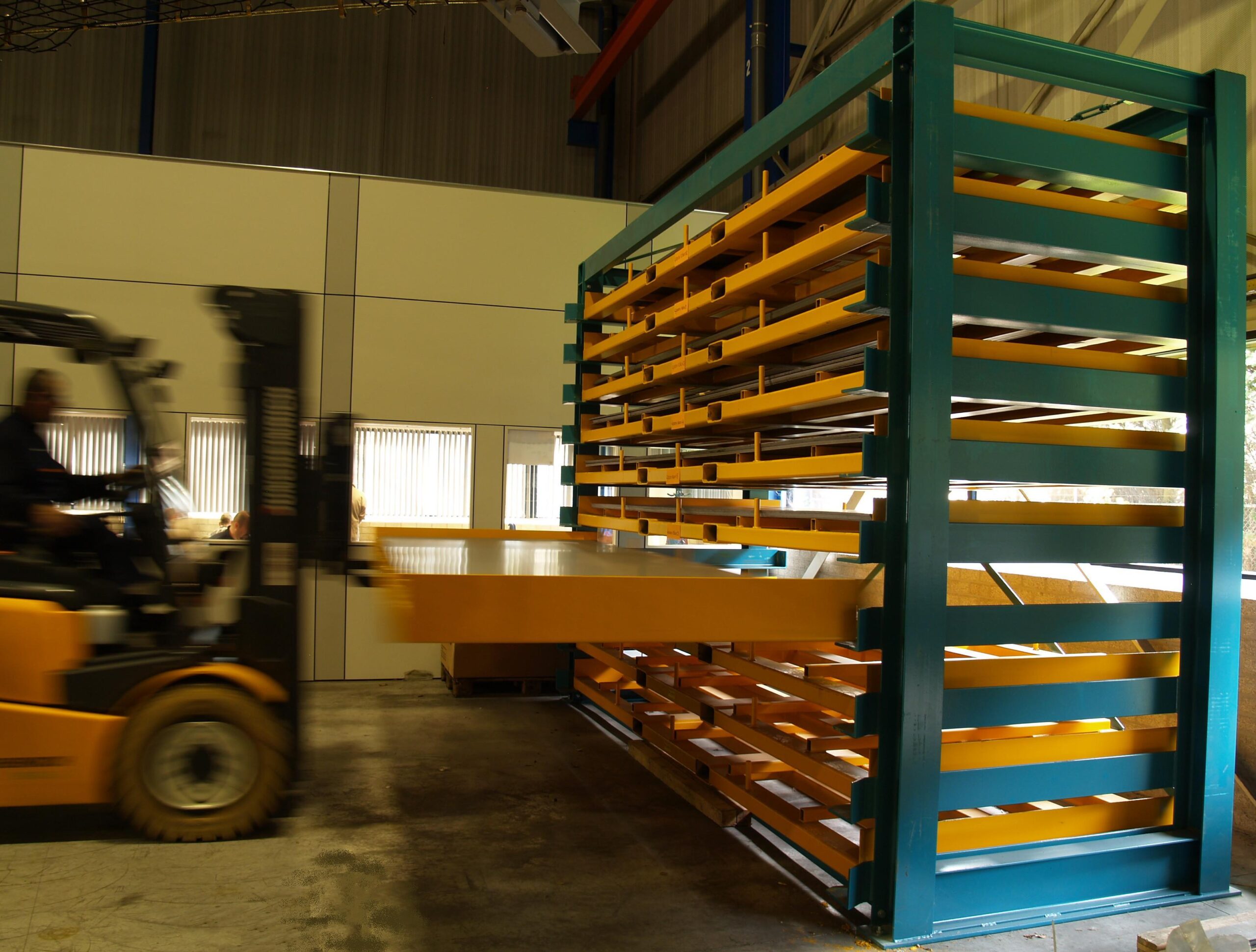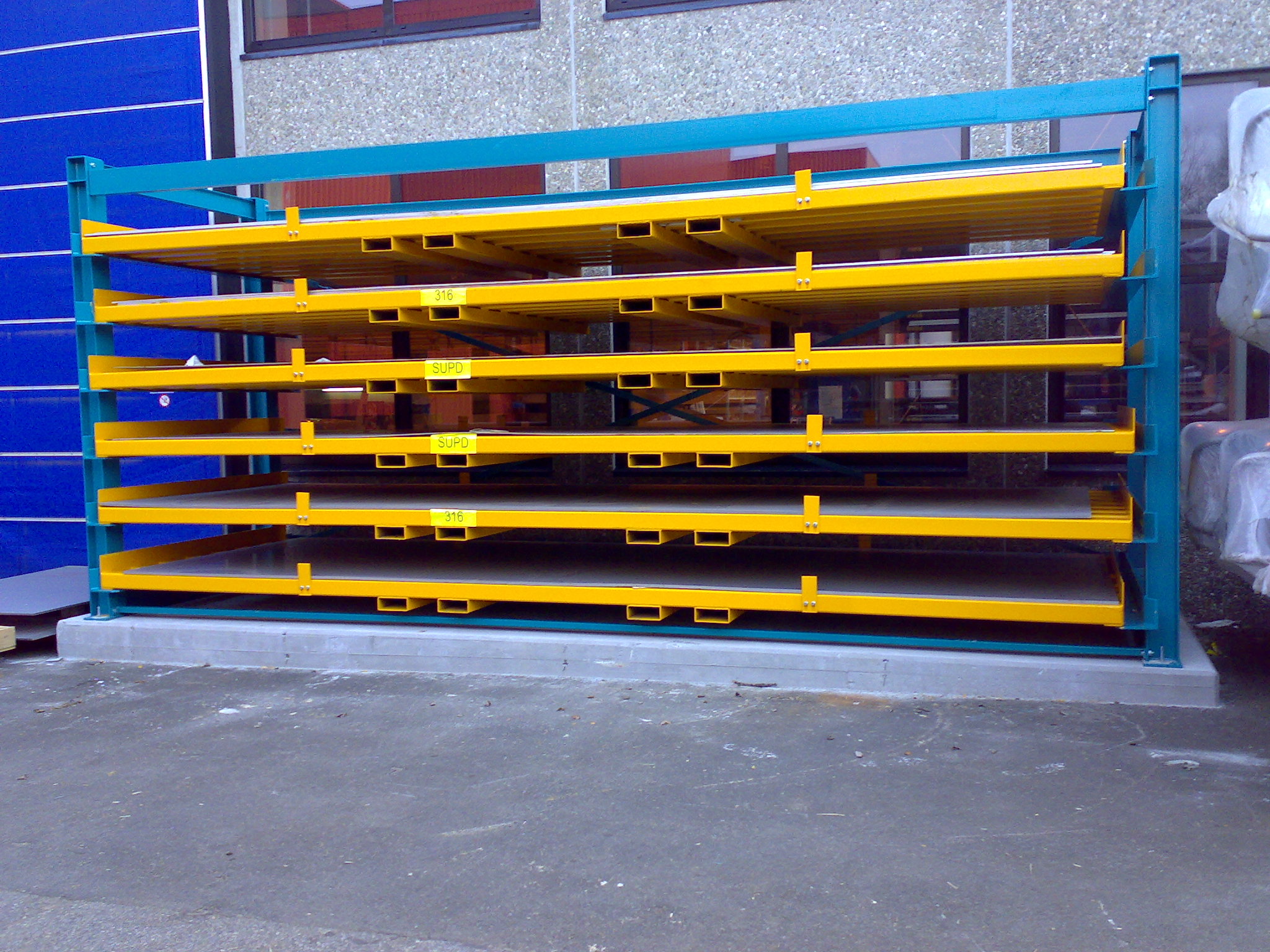 Zeer stabiel insteek cassetten magazijn voor de opslag van plaatmateriaal. De 10 cassetten zijn volledig uitneembaar met een vorkheftruck. De Plato is een stabiele, gelaste en demontabele constructie waarin plaatmateriaal veilig opgeslagen kan worden zonder de gebruikelijke houten pallets.
